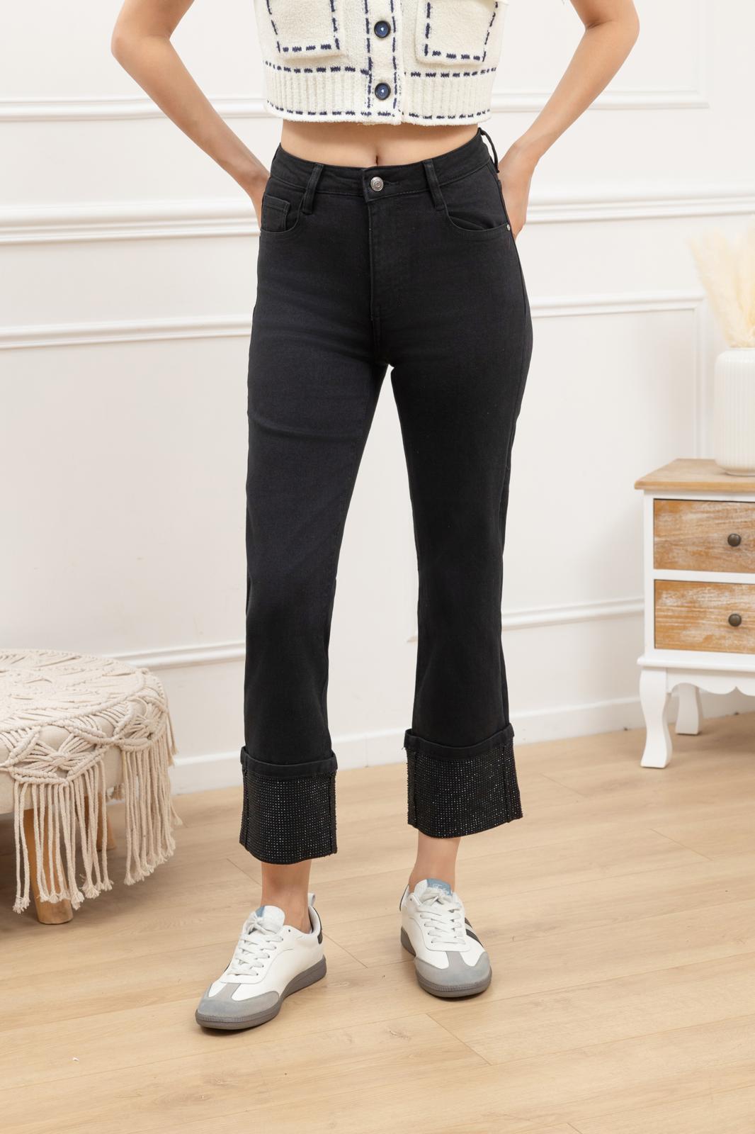 Ce jean noir combine confort, modernité et une subtile touche d’éclat. Sa coupe droite et taille haute flatte la silhouette tandis que les revers ornés de strass ton sur ton ajoutent une note élégante et originale.