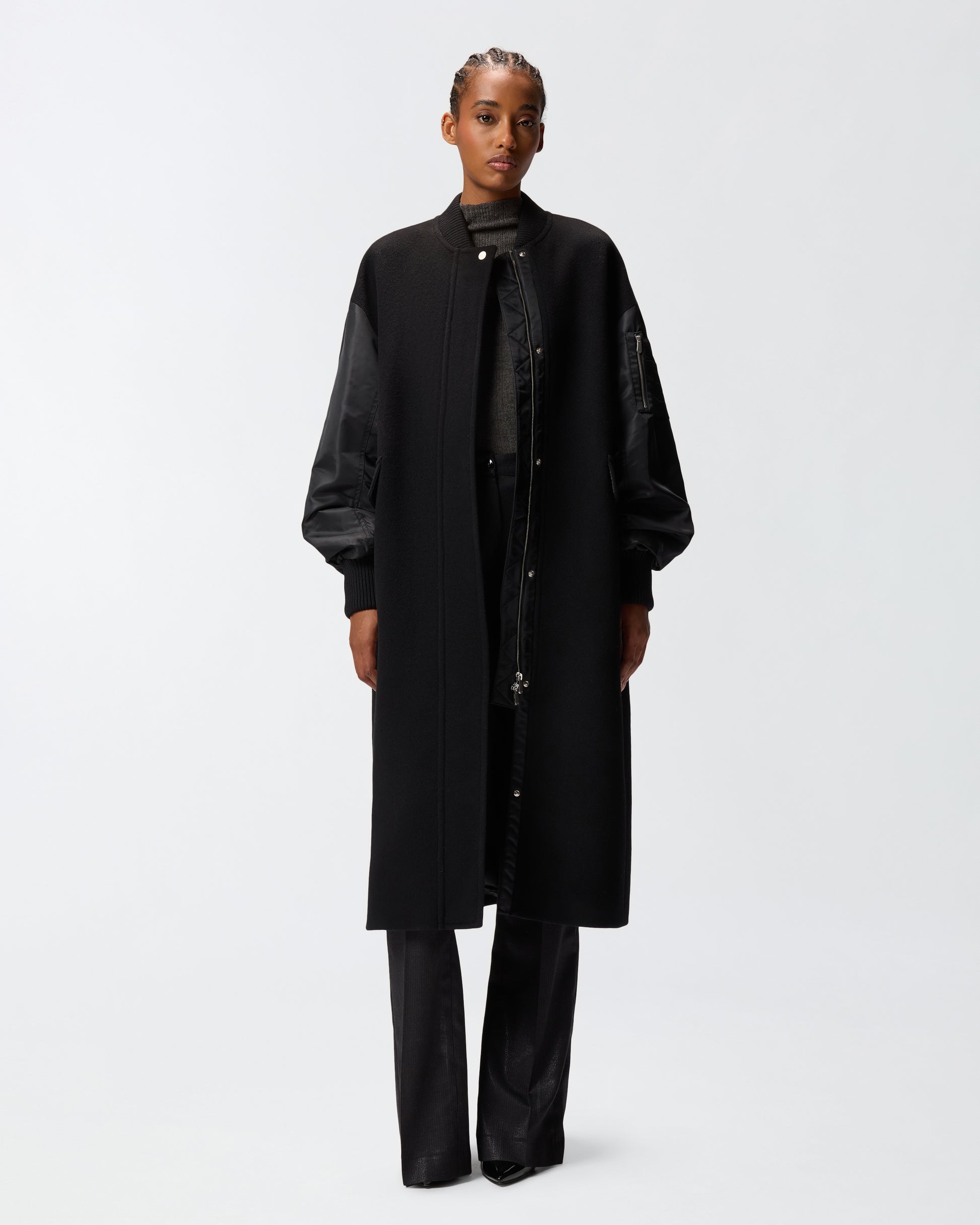 Manteau long doublé avec col bomber, poches à rabat et poche zippée sur une manche. Modèle chaud et doux en drap de laine mélangée à manches longues en satin technique.