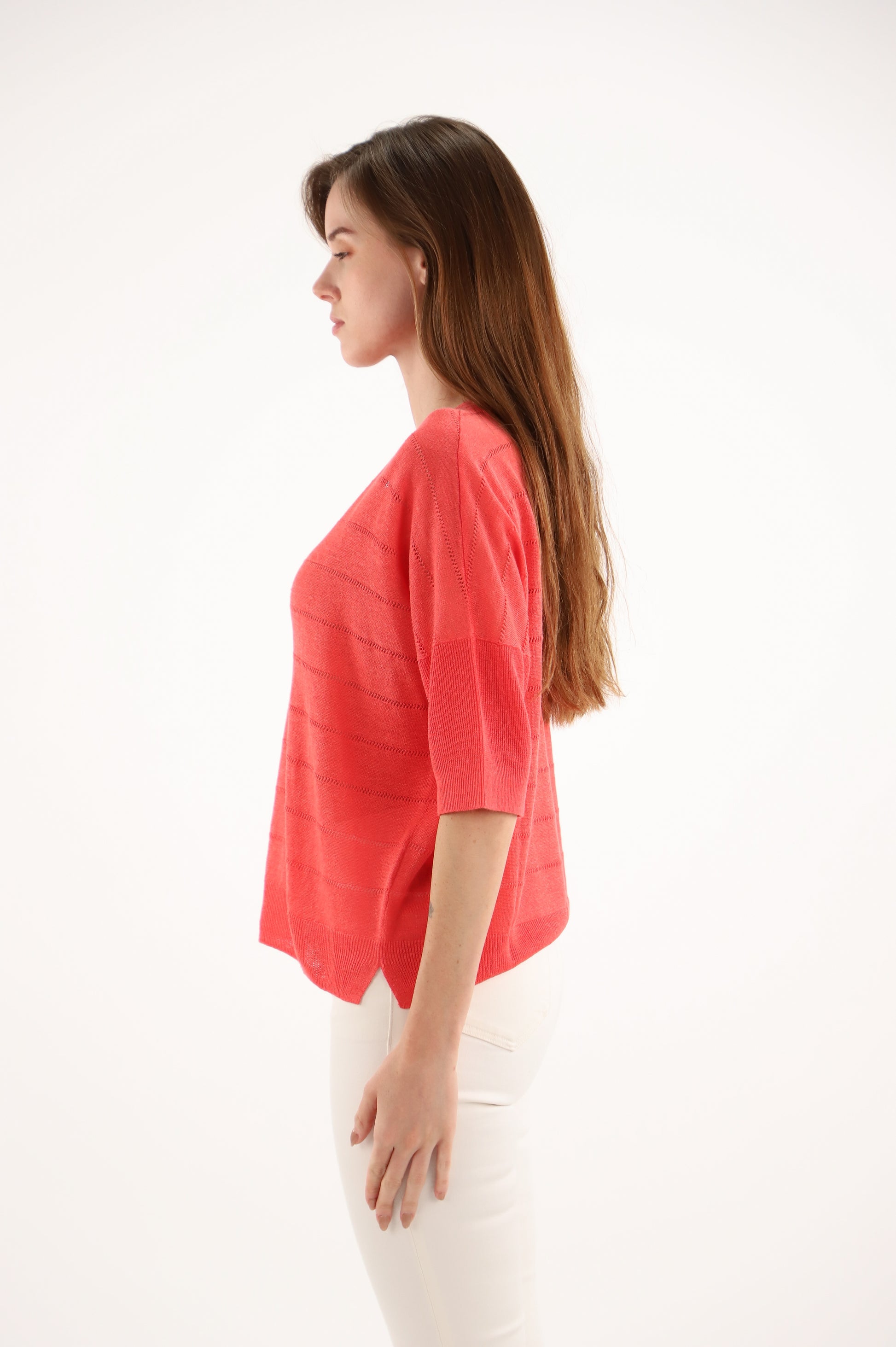 DESCRIPTION: Pull orange, rayures ajourées, confortable, casual chic, look printemps été.